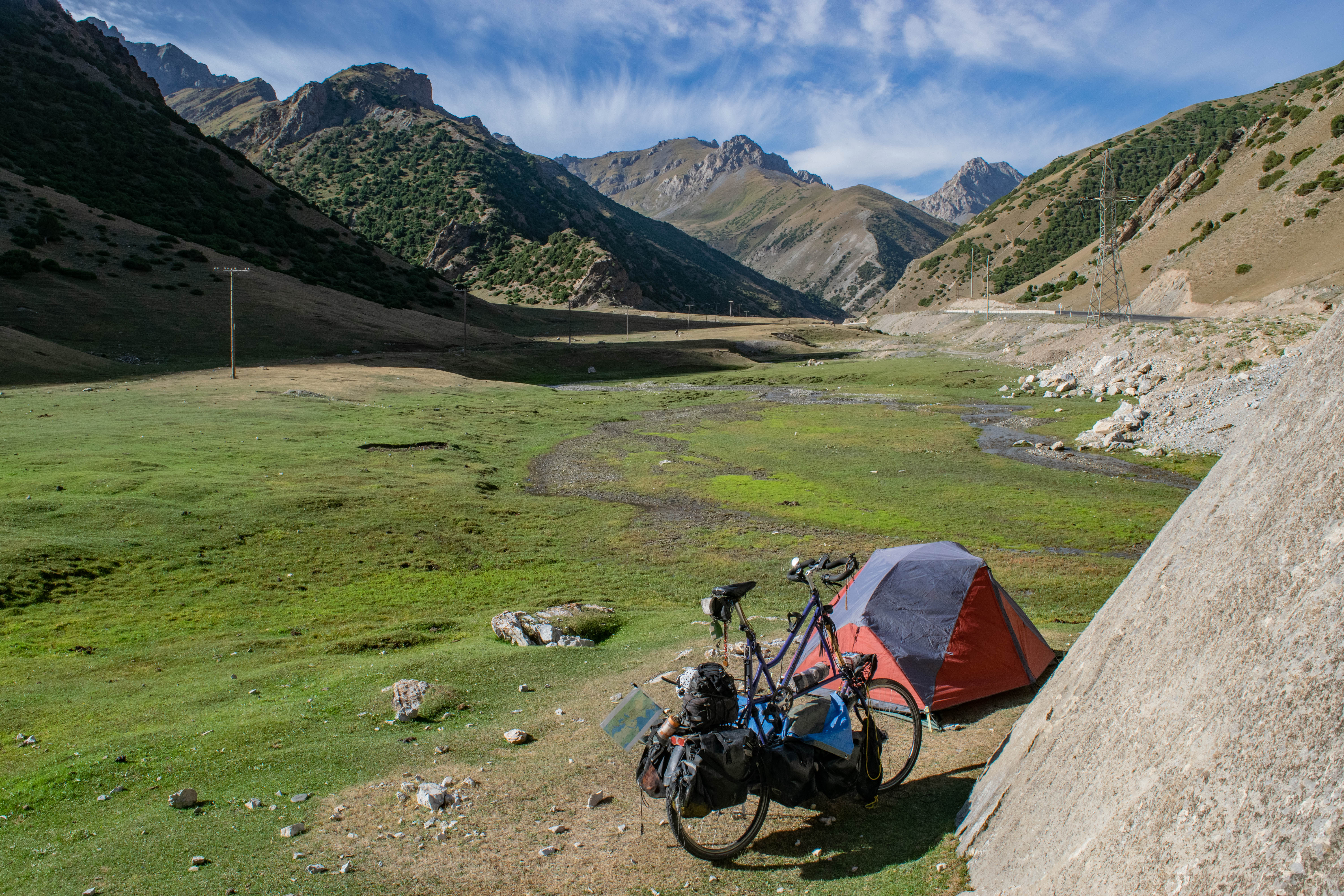 Los siguientes días fueron de bastante tensión, sobre todo al atardecer, primero por el miedo de pillar un control (y que esta vez no colara que era capaz de llegar a Tashkurgan ese mismo día) y, segundo, porque había oído que, si me pillaban acampando, tenía que pagar un taxi hasta el próximo hotel. El problema es que en esta zona de China unos hoteles son para locales y otros para turistas y, de estos segundos, solo había en la ciudad que había dejado atrás y en la que me esperaba, con lo que, aparte de perderme esa espectacular ruta, me iba a salir caro el taxi (y eso suponiendo que apareciera uno donde pudiera meter a Vita). En la carretera también había cámaras cada poco, así que me esperaba a que hubiera poca luz y, cuando encontraba un sitio para acampar, salía rápido de la carretera pidiéndole al universo que no hubiera nadie mirando lo que grababa esa cámara. Desgraciadamente el estrés no acababa ahí. El gobierno tiene muy bien entrenada a la gente y me habían comentado que, si alguien me veía acampando, iba a llamar a la policía. No porque creyera que yo era una amenaza, ni porque les pareciera mal lo que hacía, sino porque, desde pequeños, les han enseñado que si ven algo raro tienen que llamar a la policía, así que, en ese caso, solo estarían haciendo “lo que tienen que hacer”. Me escondía bastante, aún así, un par de noches me rallé con el sonido de algún coche que se acercaba y, una mañana, en la que pasó un hombre en burro y me vio, desmonté lo más rápido que pude y salí de allí sin ni siquiera desayunar por si daba la voz de alarma.
