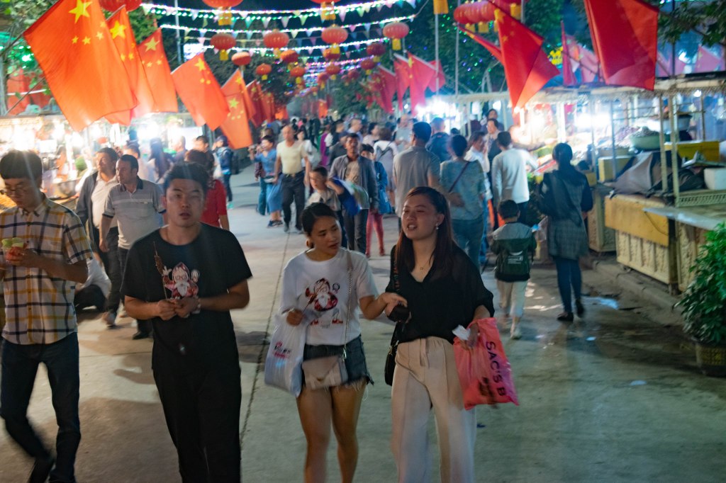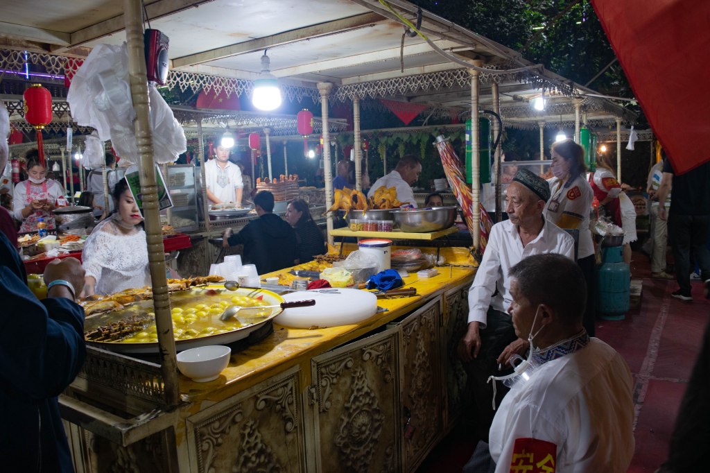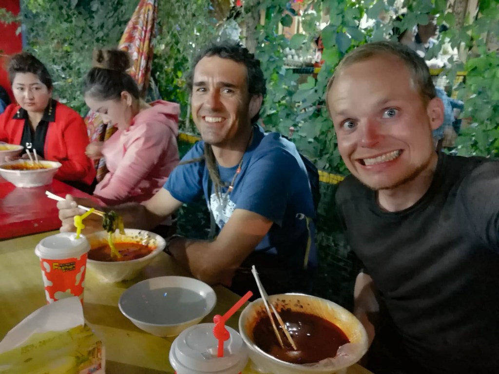 Otro día, ya atardeciendo, paré en sitio que tenía unas tiendecitas. Habían varias caravanas allí cerca y enseguida sus ocupantes se acercaron y me invitaron a cenar con ellos. No sé qué programa era, pero tenían un software de traducción automática que funcionaba estupendamente (estoy hablando de hace 4 años y, entonces, el traductor de google no iba tan bien) así que, además de una deliciosa cena, disfruté de una buena conversación con gente local. Al terminar, insistieron que montara mi tienda entre sus caravanas, pero les expliqué que les podía meter en problemas y, aunque parecía que no lo acababan de entender (eran de la etnia “Han” y para ellos lo de los controles y cámaras era solo por la supuesta presencia de terroristas) me despidieron deseándome suerte y bendiciones.